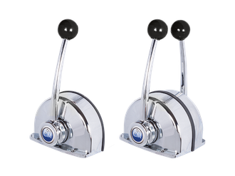 Машинки дистанционного управления газом и реверсом классической конструкции в хромированных корпусах. Варианты с одним и двумя управляющими рычагами. Каждый рычаг управляет одновременно газом и реверсом. В качестве опции могут снабжаться выключателем-блокиратором нейтрали. Позволяет отключить перекладку реверса для прогрева двигателя. Совместимы с тросами универсального типа (с резьбовыми наконечниками).